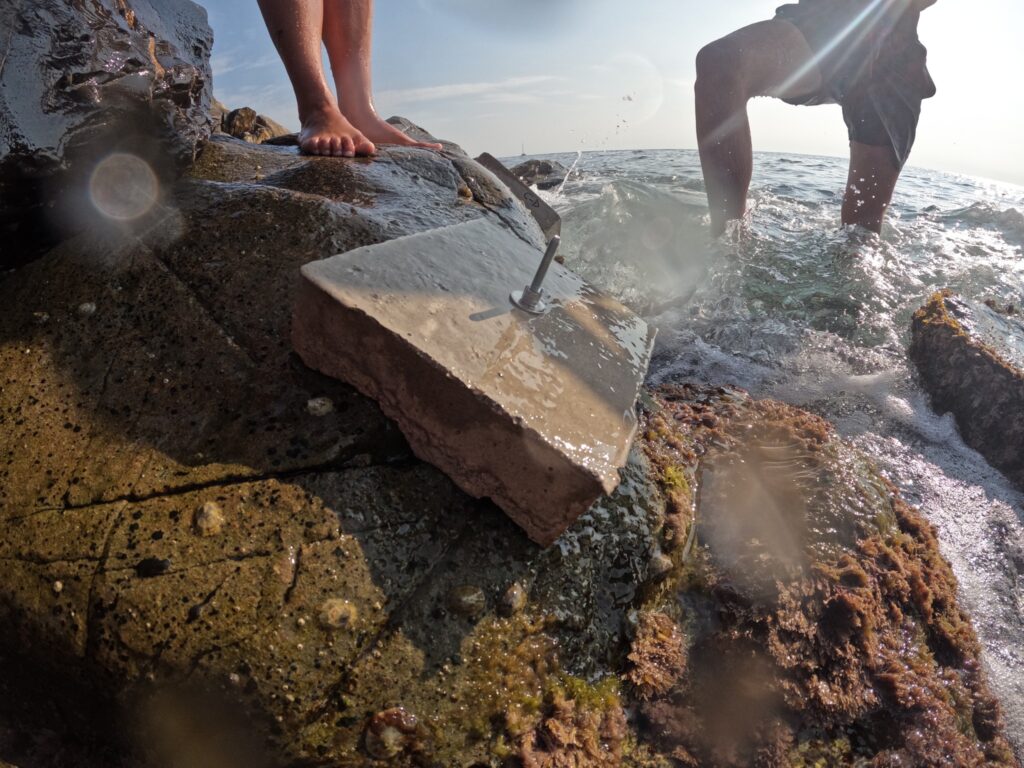 Come è facile intuire non tutto è andato liscio al primo tentativo: dai permessi per iniziare le sperimentazioni sul campo alla scelta dei materiali e degli strumenti più indicati, dalla furia del mare che non ci ha mai risparmiati né al momento di posizionare gli NMS né dopo aver installato i supporti, dalla difficoltà di asciugatura del cemento nell’umidissima estate 2025 all’inesorabile morte delle alghe in laboratorio, sempre a causa del forte caldo.